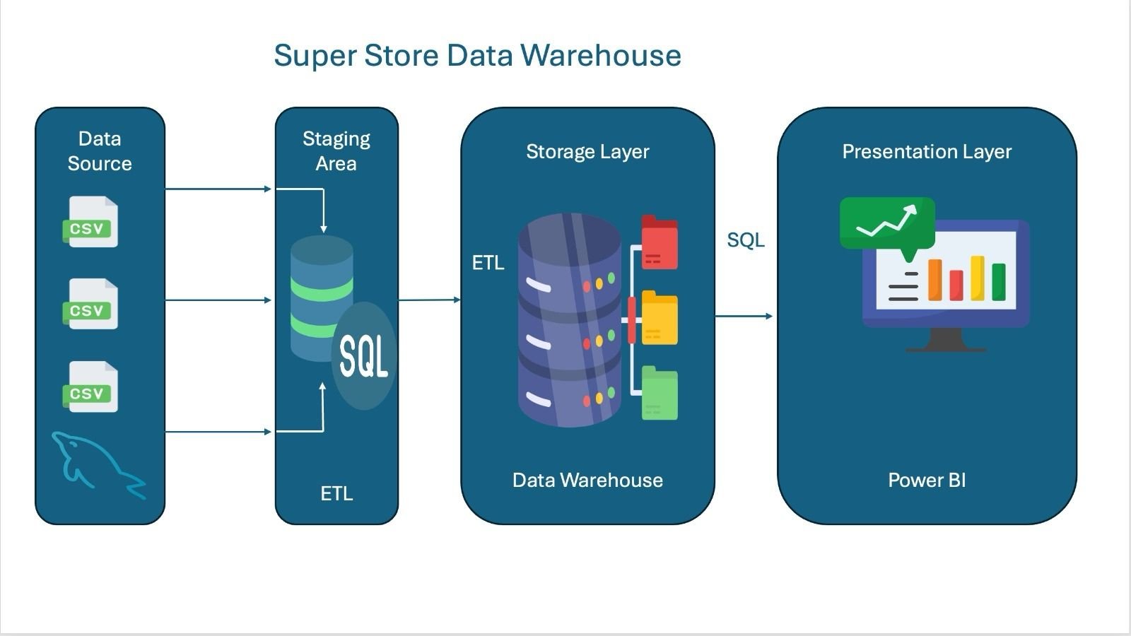 ๐Ÿฌ Super Store Data Warehouse A data warehouse project designed to analyze sales, revenue, profit, and orders across regions. Built with MySQL and Pentaho using a star schema for efficient reporting and dashboards..